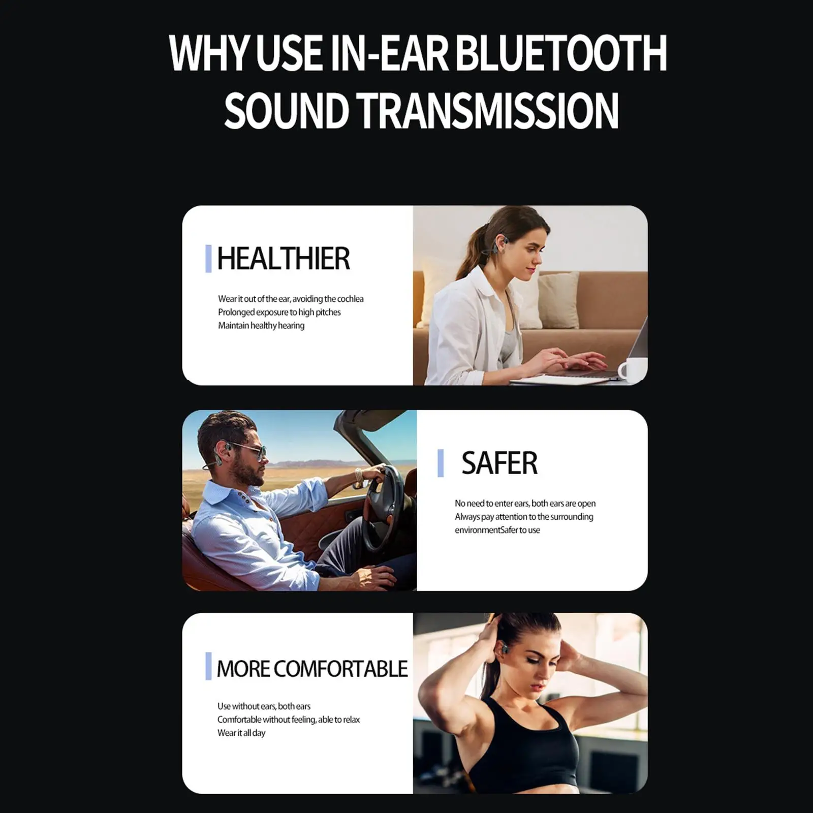 Safe driving, suitable for driving, outdoor activities, etc., can clearly receive external sounds, and can safely make calls when driving safely.